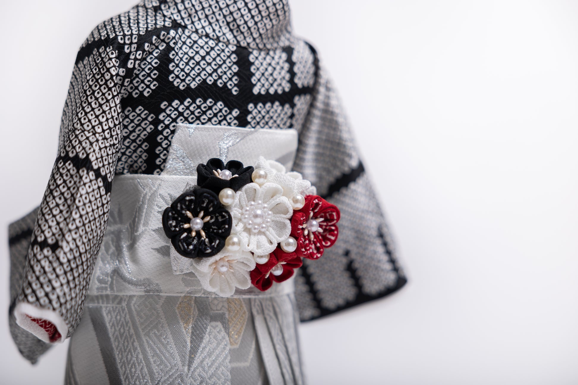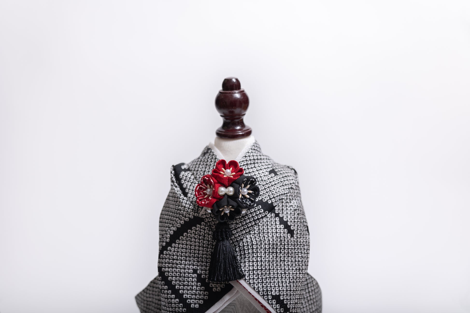 袴のつまみ細工とお揃いのえり飾り付きで胸元も華やかに。