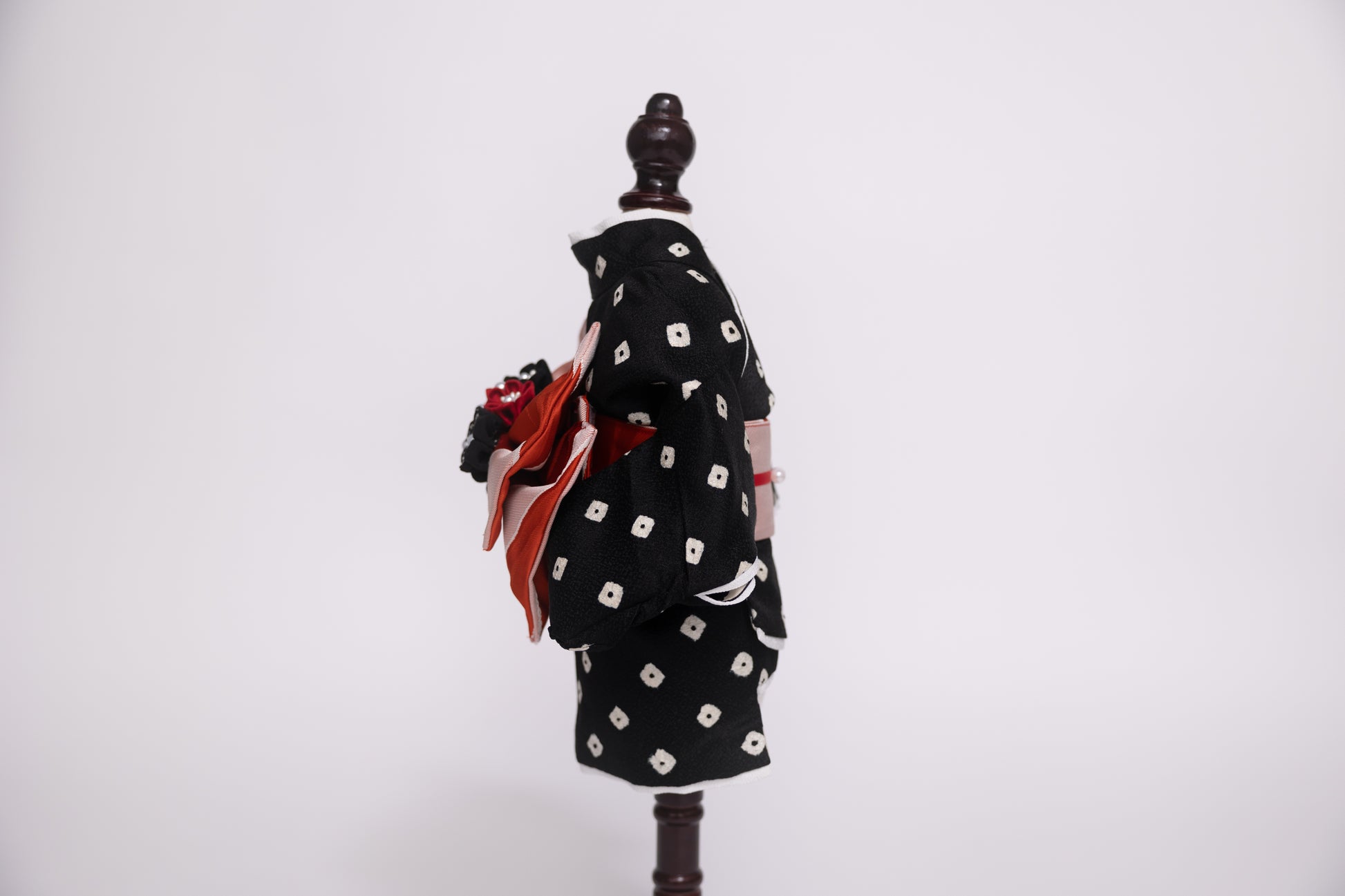• 着物:黒の絞りは正絹、クリーム色小紋は木綿